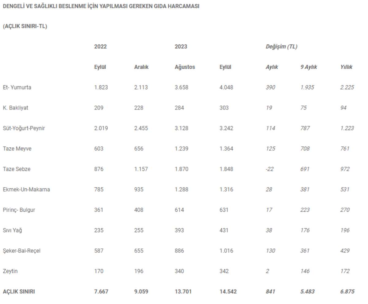 Araştırma sonuçlarına göre Eylül 2023’de dört kişilik bir ailenin açlık sınırı 13 bin 701 liradan 14 bin 542 liraya kadar yükselirken, dört kişilik bir ailenin insan onuruna yaraşır bir şekilde yoksunluk hissi çekmeden yaşayabilmesi için yapması gereken gıda ile gıda dışı harcamaların toplam tutarını gösteren yoksulluk sınırı ise 41 bin 651 liraya çıktı.