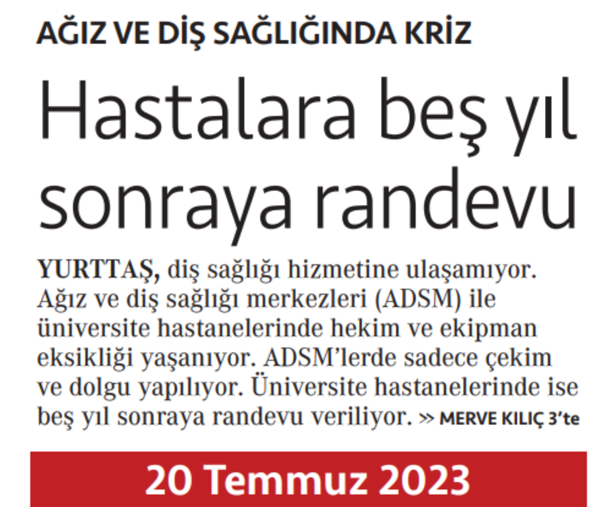 Ağız ve diş sağlığında yaşanan “5 yıl sonraya randevu” sorunu Cumhuriyet’in haberiyle gündeme geldi. Sağlık Bakanlığı ise çözüm için hekim sayısı yerine iş yükünü artırdı. Hekime fazla mesai, hastaya kısa randevu uygulaması tepki çekti.