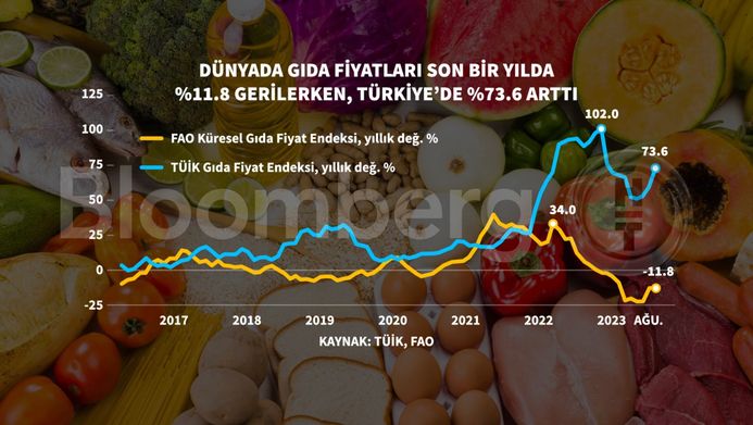 Bu verilere göre, dünyada gıda fiyatları son 1 yılda yüzde 11,8 gerilerken, Türkiye’de Gıda Fiyat Endeksi Ağustos’ta yıllık yüzde 73,6 artış gösterdi.