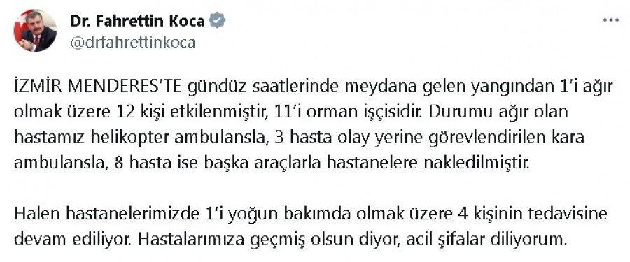 Sağlık Bakanı Fahrettin Koca, Twitter hesabından yaptığı açıklamada, İzmir’in Menderes ilçesinde gündüz saatlerinde meydana gelen yangından biri ağır olmak üzere 12 kişinin etkilendiğini ve bunlardan 11’inin orman işçisi olduğunu belirterek şunları kaydetti: