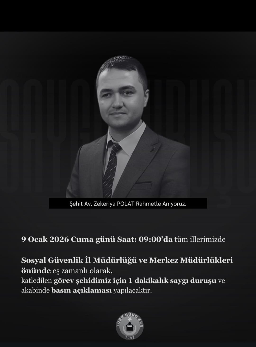 Görev şehidimiz Av. Zekeriya Polat’a Allah’tan rahmet; ailesine, yakınlarına ve tüm çalışma arkadaşlarımıza sabır diliyoruz.