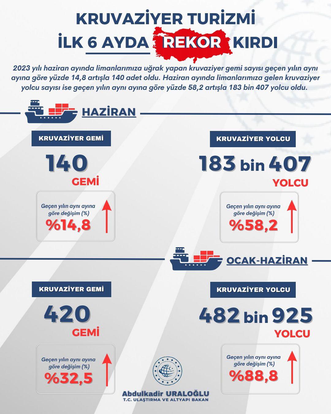 Ulaştırma ve Altyapı Bakanı Abdulkadir Uraloğlu, “2023 yılı Ocak-Haziran (6 aylık) döneminde limanlarımıza uğrak yapan kruvaziyer gemi sayısı, geçen yılın aynı dönemine göre yüzde 32,5 artışla 420 adet, yolcu sayısı da geçen yılın aynı dönemine göre yüzde 88,8 artışla 482 bin 925 yolcu oldu” dedi.