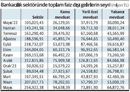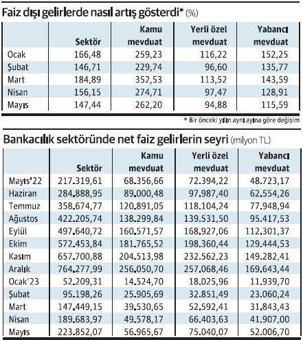 BDDK mayıs verilerinde de sektörün toplam faiz dışı gelirlerdeki yükseliş dikkat çekti. Kredilerden alınan komisyon, hizmet geliri, sigorta ve diğer gelirlerden oluşan faiz dışı gelirler bankacılık sektöründe toplam olarak mayısta geçen yıl mayısa göre yüzde 148 arttı ve 103 milyar liradan 255 milyar liraya yükseldi. Aynı dönemde net faiz gelirleri ise sadece yüzde 3 arttı ve 217.3 milyar liradan 223.8 milyar liraya çıktı. Kamu mevduat bankalarının faiz dışı gelirleri geçen yıl mayısa göre yüzde 262,2 artarak 26.1 milyar liradan 94.6 milyar liraya ulaştı. Kamu mevduat bankalarının net faiz geliri ise yüzde 16,6 azaldı ve geçen yıl mayıstaki 68,4 milyar lira seviyesinden 56.9 milyar liraya geriledi. Yerli özel mevduat bankalarının faiz dışı geliri mayısta geçen yıl mayısa göre yüzde 95 artış gösterdi. 37.9 milyar liradan 73.9 milyar liraya yükseliş yaşandı. Net faiz gelirleri ise yerli özel mevduat bankalarının yüzde 3,65 arttı ve 72.4 milyar liradan 75 milyar liraya çıktı.