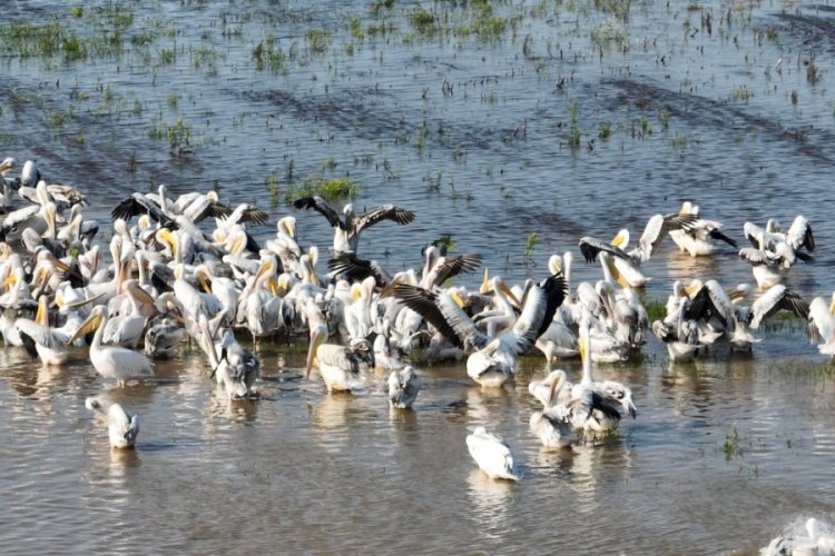 Her yıl bahar mevsimde Afrika kıtasından göçüp üremek için Romanya’nın Tuna deltasına giden Ak pelikanlar Uluabat Gölü’nde mola verdi. Afrika’nın tozundan ve yol yorgunluğundan Ulubat Gölü’nde banyo yaparak arınan ak..