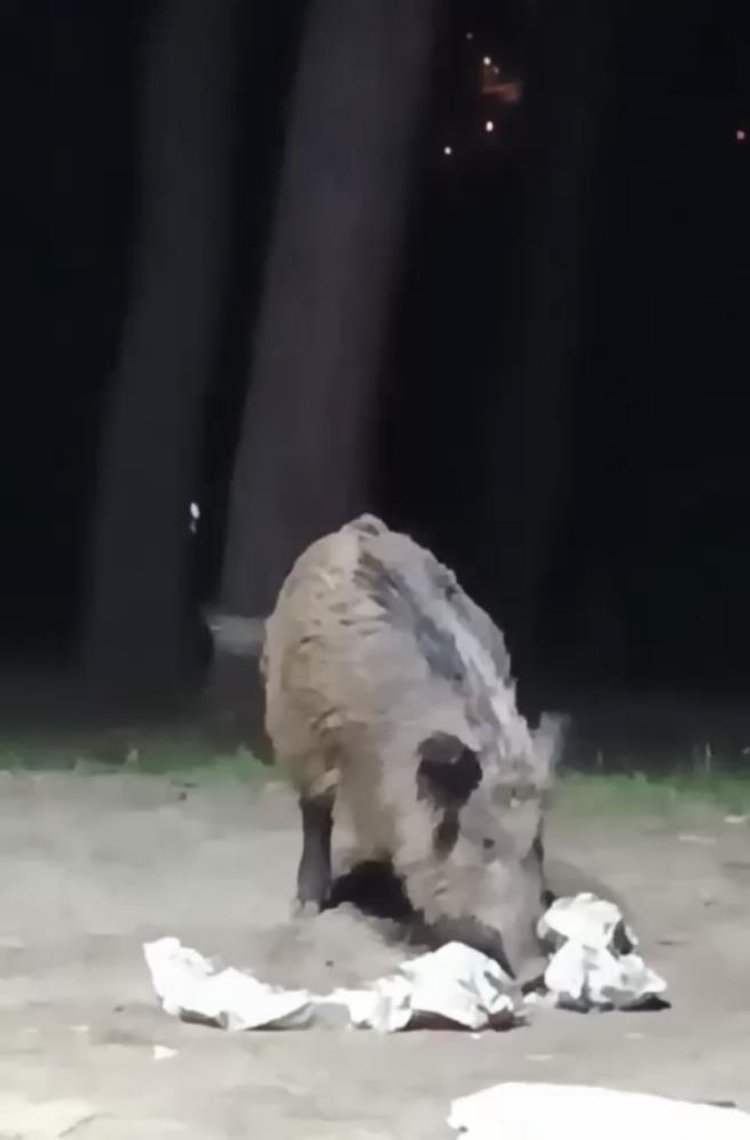 Çöp konteynırlarından yemek arayan domuzlar bir süre sonra ise ağaçlık alana girerek gözden kayboldu.
