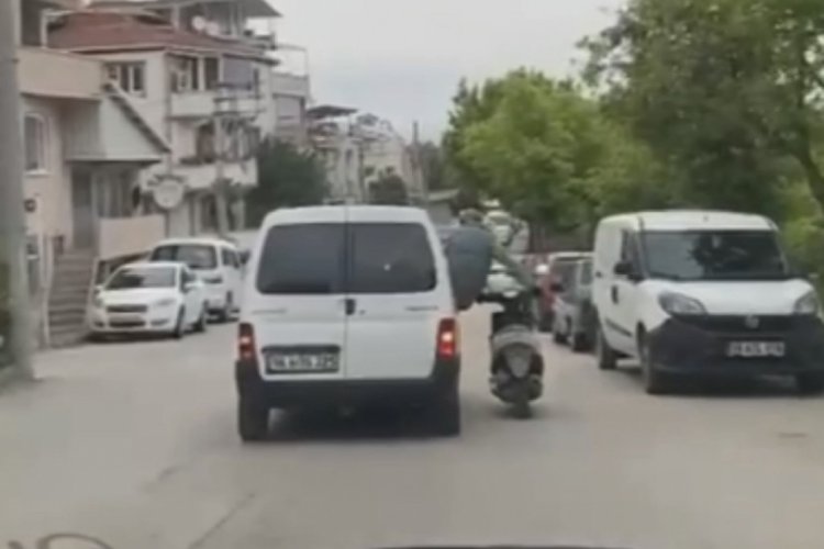 Bursa’da üzerinde sürücüsü bulunmayan motosikleti hafif ticari aracın camından sarkarak götüren şahıs, trafikte tehlikeye davetiye çıkardı.