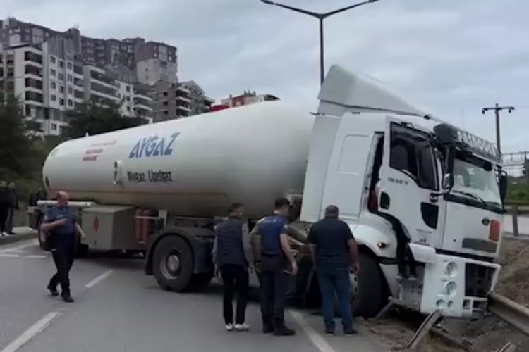 Bursa’nın Gemlik ilçesinde meydana gelen trafik kazasında sürücüsünün direksiyon hakimiyetini kaybettiği gaz yüklü TIR, kontrolden çıkarak bariyerlere çarptı.