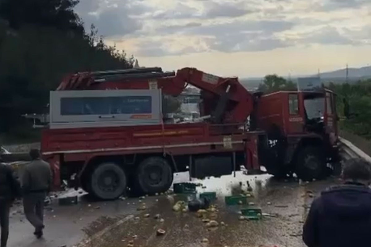 Bursa’da meyve ve sebze yüklü kamyon ile vinç çarpıştı. Kaza sonrası kamyonun kasasında bulunan meyve ve sebzeler yola dökülürken, şehirlerarası yol trafiğe saatlerce kapandı.