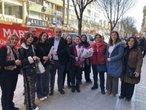8 Mart Dünya Emekçi Kadınlar Günü dolayısıyla düzenlenen etkinlikte, kadınların eşitlik ve özgürlük mücadelesine dikkat çekildi. İlçe binası önünde gerçekleştirilen etkinlikte çok sayıda kadına çiçek hediye edildi.