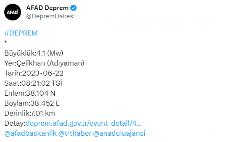 AFAD’dan edinilen bilgiye göre, Adıyaman’ın Çelikhan ilçesinde 4.1 büyüklüğünde deprem meydana geldi.