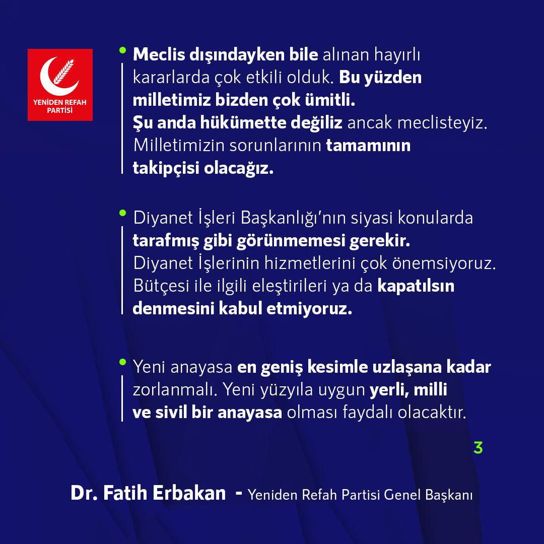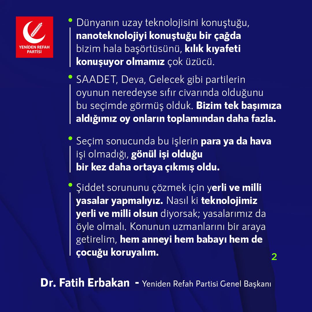 Tüm milletimizi fikirleriyle, duruşuyla, söylemleri ve eylemleriyle Erbakan Hocamızın yolunu devam ettiren, Milli Görüş’ün tek partisi Yeniden Refah Partisi’ne davet ediyorum. ▪️Dünyanın uzay teknolojisini konuştuğu, nanoteknolojiyi konuştuğu bir çağda bizim hala..