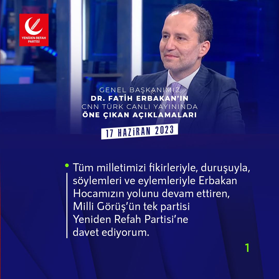 Tüm milletimizi fikirleriyle, duruşuyla, söylemleri ve eylemleriyle Erbakan Hocamızın yolunu devam ettiren, Milli Görüş’ün tek partisi Yeniden Refah Partisi’ne davet ediyorum.