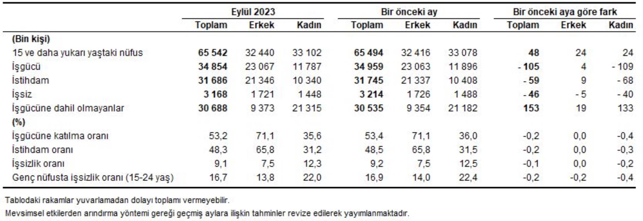 şgücü 2023 yılı eylül ayında bir önceki aya göre 105 bin kişi azalarak 34 milyon 854 bin kişi, işgücüne katılma oranı ise 0,2 puan azalarak yüzde 53,2 olarak gerçekleşti. İşgücüne katılma oranı erkeklerde yüzde 71,1 iken kadınlarda yüzde 35,6 oldu.