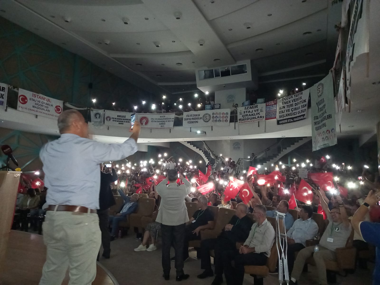 Bundan sonra eline tornavida herhangi bir çekiç almana gerek yok diyeni duydunuz mu? Hayır. Hiçbir zaman duyamazsınız. Çünkü Çıraklık ve stajyerlik hakkı verilmeyen ucuz bir işçilik. Görüyorsunuz ki hakiki yıllar sonra sigorta da bile verilmiyor Şimdi bugün insanlar sosyal güvenlik sistemiyle doğruları, yanlışları merak ediyor. Sosyal Güvenlik Kurumu’nun iki bin on dokuz yılından beri ev yaptığı en önemli konu ne biliyor musunuz? Bir çalışma gerçekten fiili mi değil mi? Yani bir kişi bir şehirde çalışmış mı çalışmamış mı? Eğer bir çalışmak bu çalışmaları iptal edelim. Günleri saymayalım. Emeklilik için çalışmaya devam etsinler. Peki ben sizin huzurlarınızda soruyorum. Çırak mesaj verilişi yerine geçen çalışması, fiili mi değil mi? O içeriğinde alın teri dökmeyen var mı? Yok. Sigorta kartını cüzdanına koyup bu benim hayat garantim demeyen var mı? Yok. Aradan otuz sene geçmiş. Niye kabul edilmiyor? Cevap yok. Neden? Çünkü sistem demiş ki, çırak ve stajyer, çocuk çocuk çocukları bir bir çocukken okumayı öğrendik. Biz çocukken adam olmayı, büyük olmayı, alın teri dökmeyi iş yerinde çalışmayı öğrendik. Işte çırak mesailerini karşısında bize hayatı kazandırdı. Mesleği kazandırdı. Emeği Iş gücünü kazandırdı. Hatta parayı kazandırdı. Ama emeklilik kazanılmasın diye kırk sene önceki yasaları kaldırıp önümüze direniyorlar. Ve diyorlar ki bu yasalarda bu haklarınızı alamamışsınız. O zaman bu hak çiğneyen yasalar değiştirilmeli. O zaman bu yasalar yeniden düzenlendi Onde biri, yirmi senede sürekli sosyal güvenlik yasalarında iyileşmeler oluyor, bazen de bozulmalar oluyor. Ama bin dokuz yüz elliden gelen destekler kanunu bin dokuz yüz altmışlardan gelen devlet memurluğu kanunu bin dokuz yüz yetmişten gelen mağdur kanunu hep aynı değil. O zaman üç bin üç yüz sekiz sayılı, çırak kanunla aynı kalmamalı. Bununla alakalı yapılması gereken düzenleme çok kolay ve basınç çıkar. Alın teri döker, o an iş yerinde bulunan hiçbir zaman patronu öğretmen olmayan, hiçbir zaman arkadaşları okul arkadaşı olmayan, ay sonunda bir ücret alan çalışanların hiçbir şekilde bu konudaki hakları mağdur edilmemeli. Ve biz buradan sizin huzurlarınızda en büyük yetkililere sesleniyoruz. Sosyal güvenlik alanındaki en büyük mağduriyetlerden bir tanesi olan çırak ve stajyerlerin alın terini verin. Hakkını bu vatandaşlarımızın mağduriyeti artık son olsun Ekim ayında mesajlar verip bayramı olsun diyorum. Hukukumuzu anlatıyoruz her yerde. Her platformda gerek başında, gerek gazetede, gerekse bir araya geldiğinde tabii her şeyi ben söylerken benden sonraki konuşmacı dostlarıma fırsat kalmaz. Mücadelemize devam edeceğiz diyerek sözlerimi noktalamak istiyorum.”