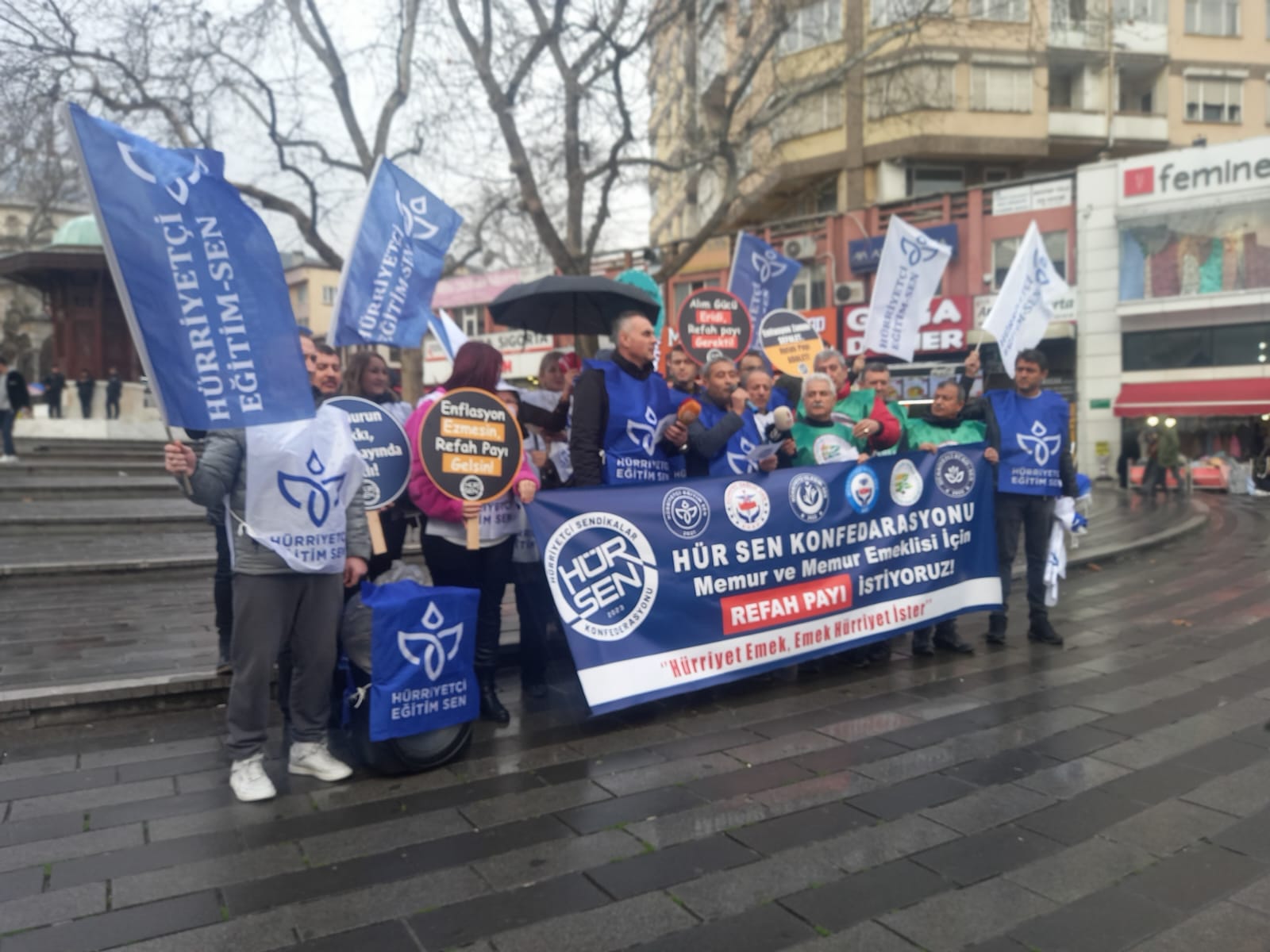 Bursa’da Hür-Sen Konfedarsyonu kendisine bağlı sendikalarla birlikte 15 Temmuz Demokrasi ve Şehreküstü Meydanı’nda bir açıklama yaptı. Konfedarasyon adına İl Temsilcisi Selahattin Gürses tarafından okunan metinde; “Tüm vatandaşlarımız, ağır bir ekonomik kriz ile karşı karşıya bulunmaktadır.