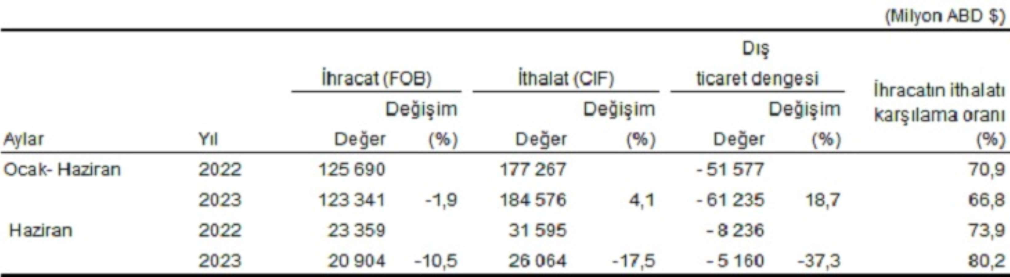 Ocak-Haziran döneminde dış ticaret açığı yüzde 18,7 artarak 51 milyar 577 milyon dolardan, 61 milyar 235 milyon dolara yükseldi. İhracatın ithalatı karşılama oranı 2022 Ocak-Haziran döneminde %70,9 iken, 2023 yılının aynı döneminde yüzde 66,8’e geriledi.