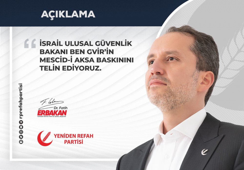 Yeniden Refah Partisi olarak, işgalci İsrail’in Ulusal Güvenlik Bakanı Ben Gvir’in Mescid-i Aksa baskınının hiçbir surette kabul edilemez olduğunu ve bu girişimi telin ettiğimizi en yüksek sesle ifade ediyoruz.