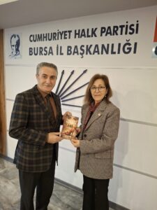 Toplumların dönüşümünde kadının rolü, yalnızca temsiliyet oranları veya istatistiklerle ölçülemez. Kadın; siyasette karar verendir, edebiyatta anlatandır, sokakta yürüyen, mücadele eden ve toplumsal hafızaya iz bırakan asli öznenin ta kendisidir. Bu gerçeklik ışığında, gazeteci ve yazar Atilla Güney, CHP Bursa İl Kadın Kolları Başkanı Nigar Savaşkan Bölüker’ı makamında ziyaret ederek, kısa süre önce yayımlanan romanı “Topuklu Kaldırımlar”’ı kendilerine takdim etti.