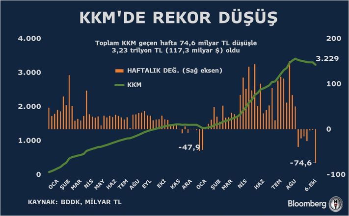 Bankacılık Düzenleme ve Denetleme Kurumu (BDDK) verilerine göre, 6 Ekim haftasında kur korumalı mevduatlar 74,6 milyar TL ile rekor düşüş kaydetti. İlgili haftada kur korumalı mevduatların büyüklüğü 3,23 trilyon TL’ye geriledi, dolar cinsinden bakıldığında ise 117,3 milyar dolarlık büyüklük kaydedildi.