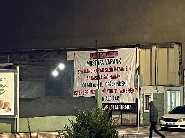 Mahkemenin sonucunu beklemeden iş yerlerini yıkan KOSAB yönetimine kızan mağdurlar dönemin bakanı AK Parti Bursa Milletvekili Mustafa Varank’a hitaben; “Sizin imzanızın arkasına sığınarak attırdıkları imzayla 100 milyon değerindeki mülkümüzü 10 milyona kamulaştırdılar” pankartı yaptırarak ilçenin görünen noktalarına astırdı.