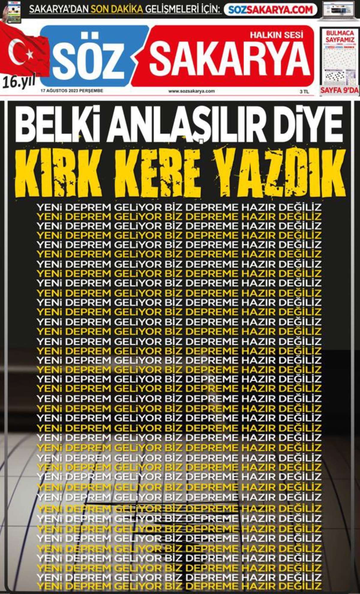 17 Ağustos’un 24. yıldönümünde yerel gazete Söz Sakarya ise depreme ilişkin çarpıcı bir manşet hazırladı.