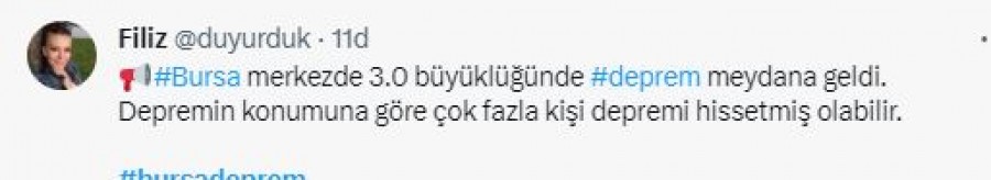 Bursa Nilüfer Tahtalı Mahallesi’nde 3.1 büyüklüğünde deprem meydana geldi. Kandilli Rasathanesi’nden edinilen bilgilere göre Bursa Nilüfer Tahtalı Mahallesi’nde 3.1 büyüklüğünde deprem meydana geldi. #DEPREM TAHTALI-NILUFER (BURSA) https://t.co/JyIZuCtfqU 29.06.2023, 21:47:48 TSİ Büyüklük: 3.1 Derinlik: 4.9 km#Kandilli..