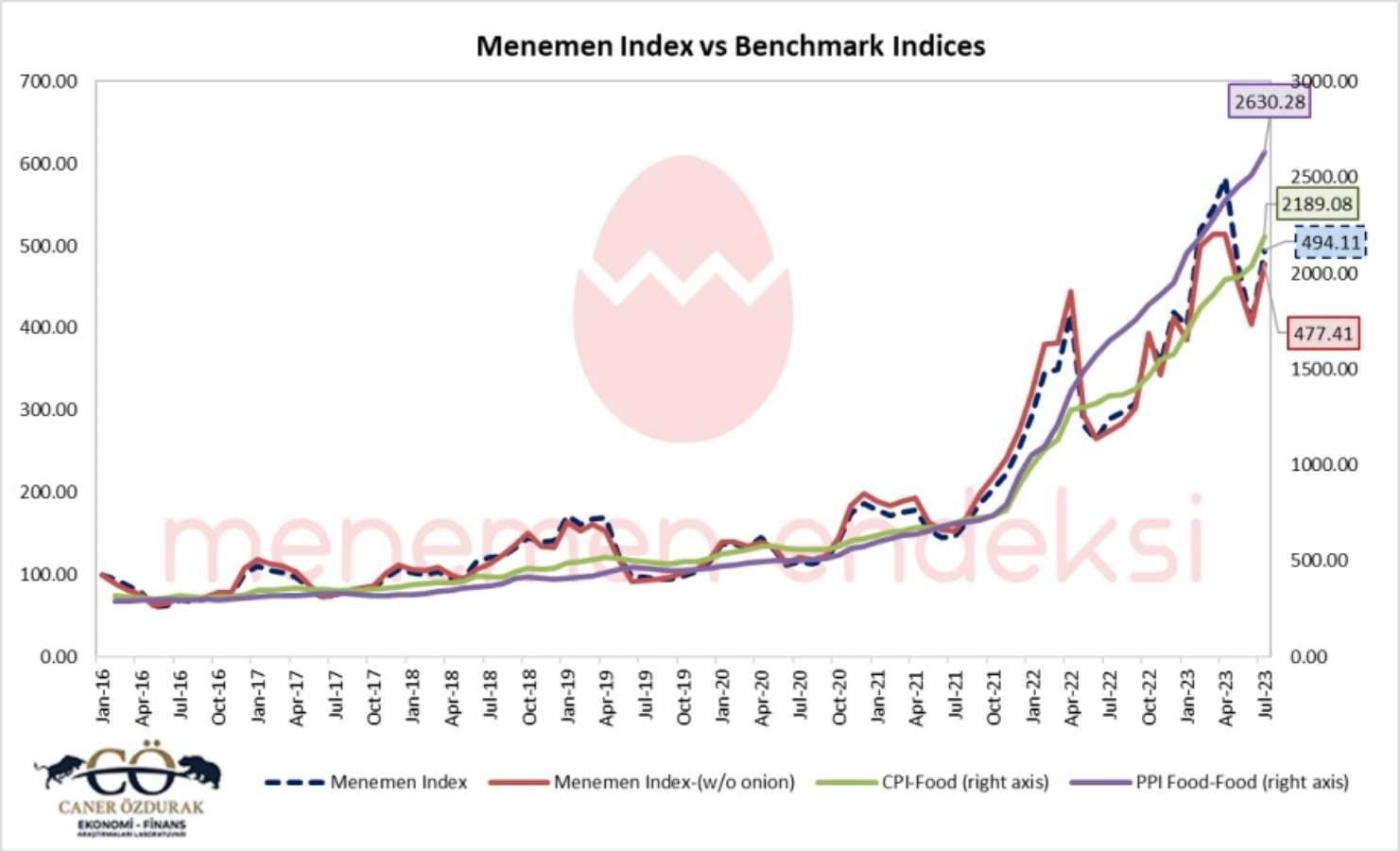 Temmuz ayı menemen enflasyonu kuru soğandaki yüzde 47’lik, Çarliston biberdeki yüzde 62’lik, ve domatesteki yüzde 81’lik artışın etkisiyle aylık yüzde 21.97 yıllık ise yüzde 70.58 olarak gerçekleşti. Menemen endeksinin yükselmesinde en fazla domatesteki zamlar etkili oldu.