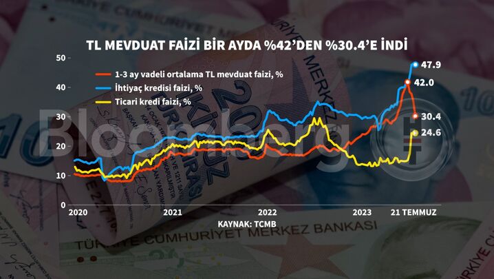 Haziran ayında mevduatlarda ortalama faiz yüzde 42 ile yılın zirvesini görmüştü. Mevduat faizlerinde yaşanan son düşüş ivmesiyle son 1 ayda yaklaşık 12 puanlık gerileme izlendi.