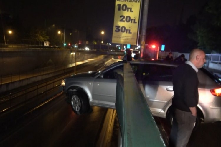 Bursa’da yağış nedeniyle kayganlaşan yolda kontrolden çıkarak bariyerlere saplanan otomobil 5 metrelik alt geçitte asılı kaldı. Sürücü kaza sonrası kendi imkanlarıyla otomobilden çıkarak olay yerinden kaçtı.
