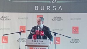 Programda konuşan Saadet Partisi Genel Başkanı Mahmut Arıkan, konuşmasına davetlilere teşekkür ederek başladı. Katılımcılara “Hoş geldiniz, sefalar getirdiniz” diyerek hitap eden Arıkan, Bursa’nın önemli değerlerinden biri olan Bursaspor’a da değindi.