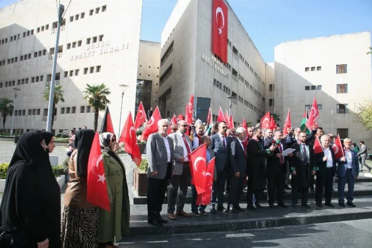 Bursa Adliyesi Cumhuriyet Başsavcılığına avukatlarıyla gelen Ali Osman Karahan İsrailli yetkililer hakkında suç duyurusunda bulunduktan sonra çıkışta basın açıklaması yaptı.