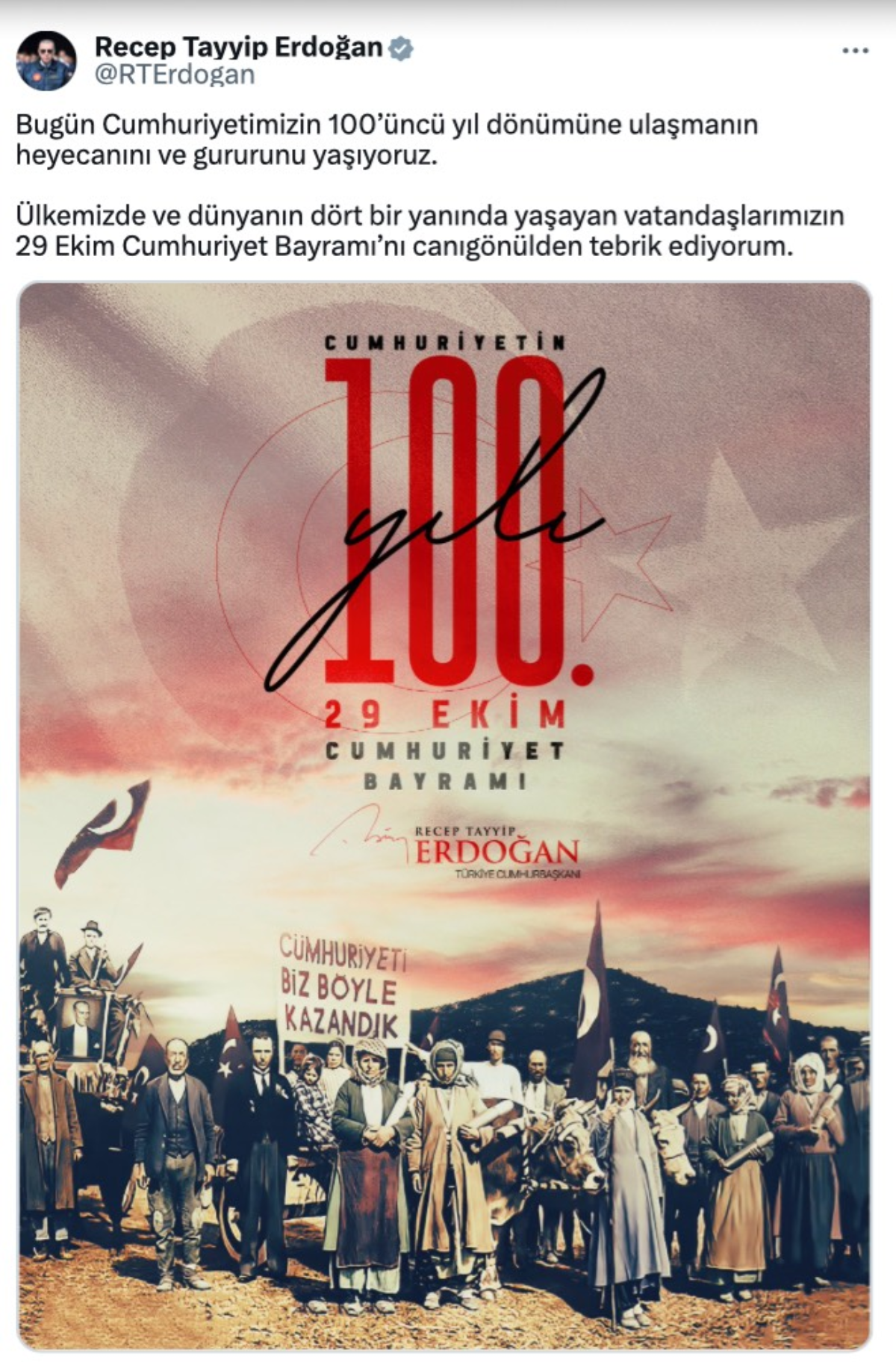 AKP’li Cumhurbaşkanı Recep Tayyip Erdoğan, Atatürk’e yer vermediği dikkat çeken 29 Ekim mesajında, “Bugün Cumhuriyetimizin 100’üncü yıl dönümüne ulaşmanın heyecanını ve gururunu yaşıyoruz. Ülkemizde ve dünyanın dört bir yanında yaşayan vatandaşlarımızın 29 Ekim Cumhuriyet Bayramı’nı canıgönülden tebrik ediyorum” ifadelerini kullandı.