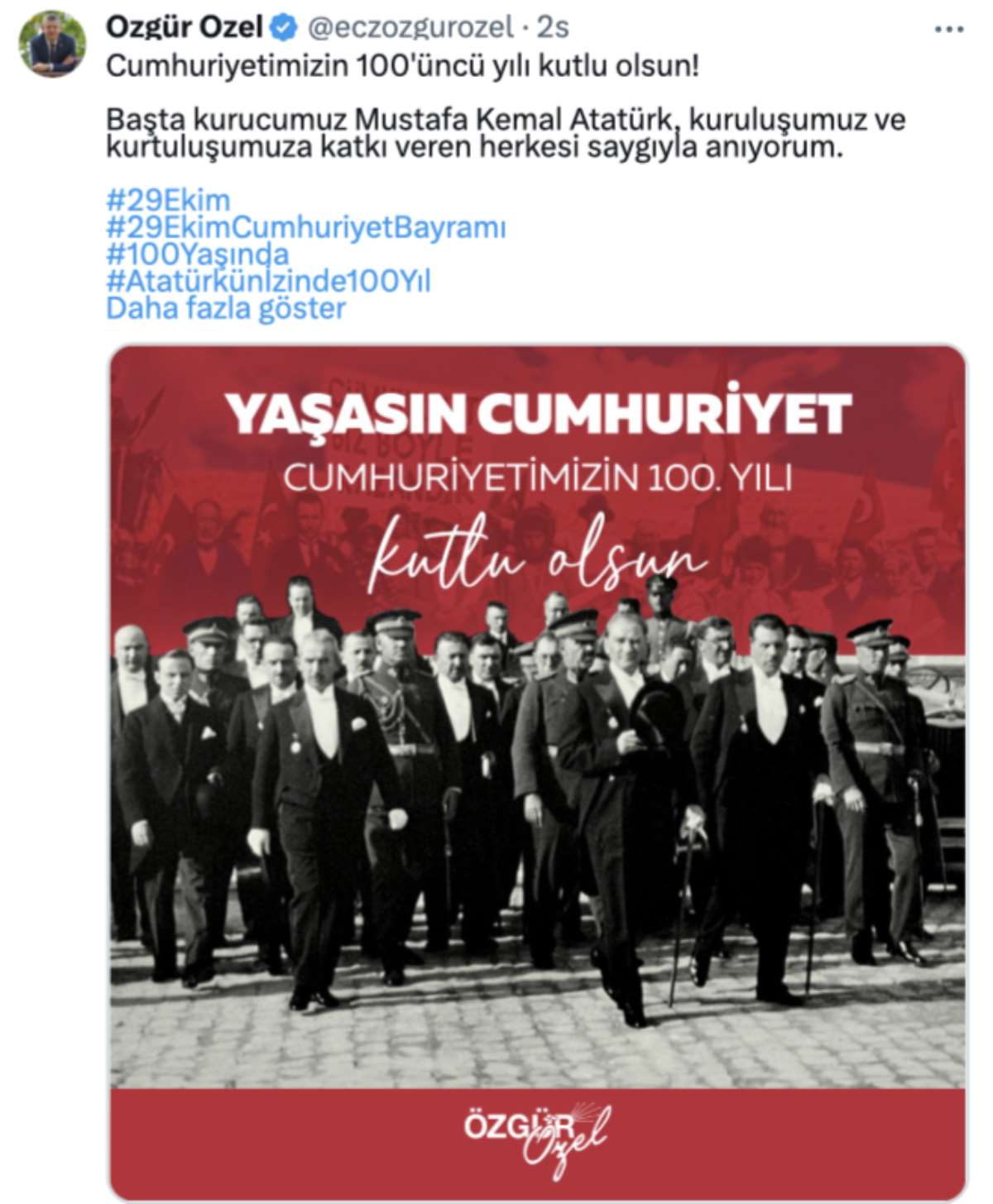 CHP Genel Başkan Adayı ve Grup Başkanı Özgür Özel de sosyal medya hesabından yaptığı paylaşımda, “Cumhuriyetimizin 100’üncü yılı kutlu olsun! Başta kurucumuz Mustafa Kemal Atatürk, kuruluşumuz ve kurtuluşumuza katkı veren herkesi saygıyla anıyorum” dedi.