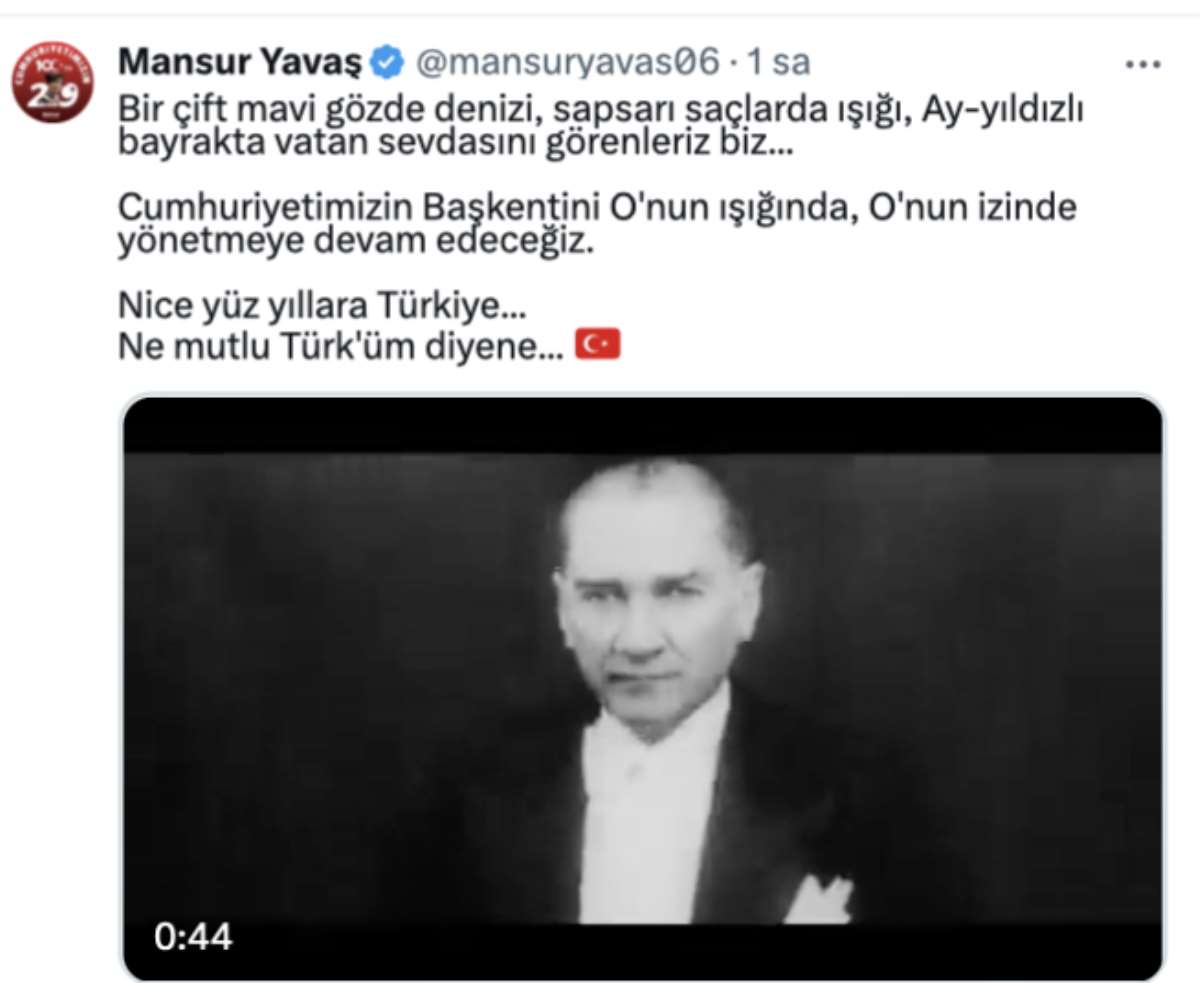 Ankara Büyükşehir Belediye Başkanı Mansur Yavaş, mesajında, “Bir çift mavi gözde denizi, sapsarı saçlarda ışığı, Ay-yıldızlı bayrakta vatan sevdasını görenleriz biz… Cumhuriyetimizin Başkentini O’nun ışığında, O’nun izinde yönetmeye devam edeceğiz. Nice yüz yıllara Türkiye… Ne mutlu Türk’üm diyene…” ifadelerini kullandı.