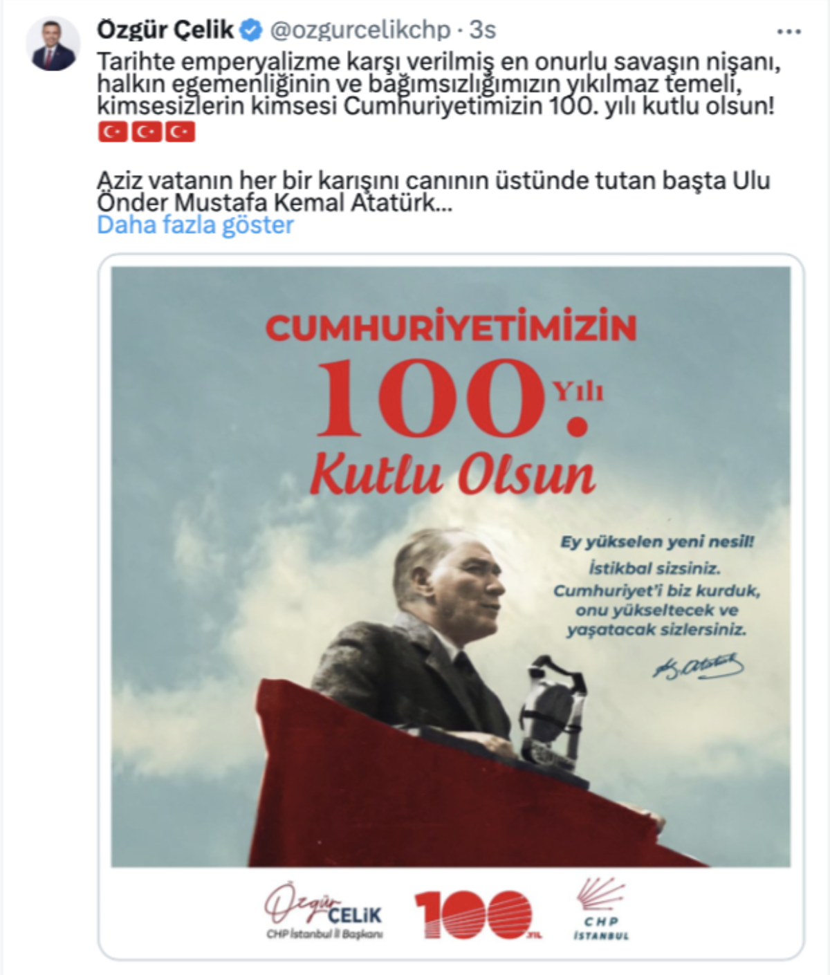 CHP İstanbul İl Başkanı Özgür Çelik, “Tarihte emperyalizme karşı verilmiş en onurlu savaşın nişanı, halkın egemenliğinin ve bağımsızlığımızın yıkılmaz temeli, kimsesizlerin kimsesi Cumhuriyetimizin 100. yılı kutlu olsun! Aziz vatanın her bir karışını canının üstünde tutan başta Ulu Önder Mustafa Kemal Atatürk ve silah arkadaşları olmak üzere tüm şehit ve gazilerimizi saygı ve minnetle anıyorum. Umut dolu nice yüz yıllara! Çok yaşa Cumhuriyet!”