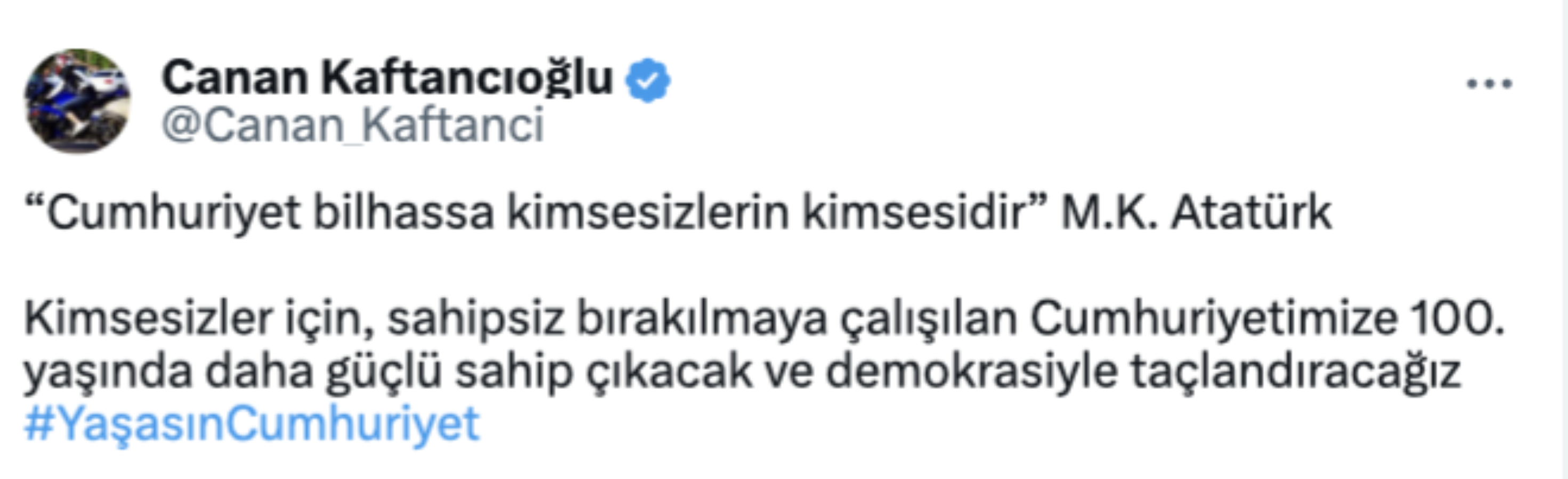 ““Cumhuriyet bilhassa kimsesizlerin kimsesidir” M.K. Atatürk… Kimsesizler için, sahipsiz bırakılmaya çalışılan Cumhuriyetimize 100. yaşında daha güçlü sahip çıkacak ve demokrasiyle taçlandıracağız. Yaşasın Cumhuriyet!”