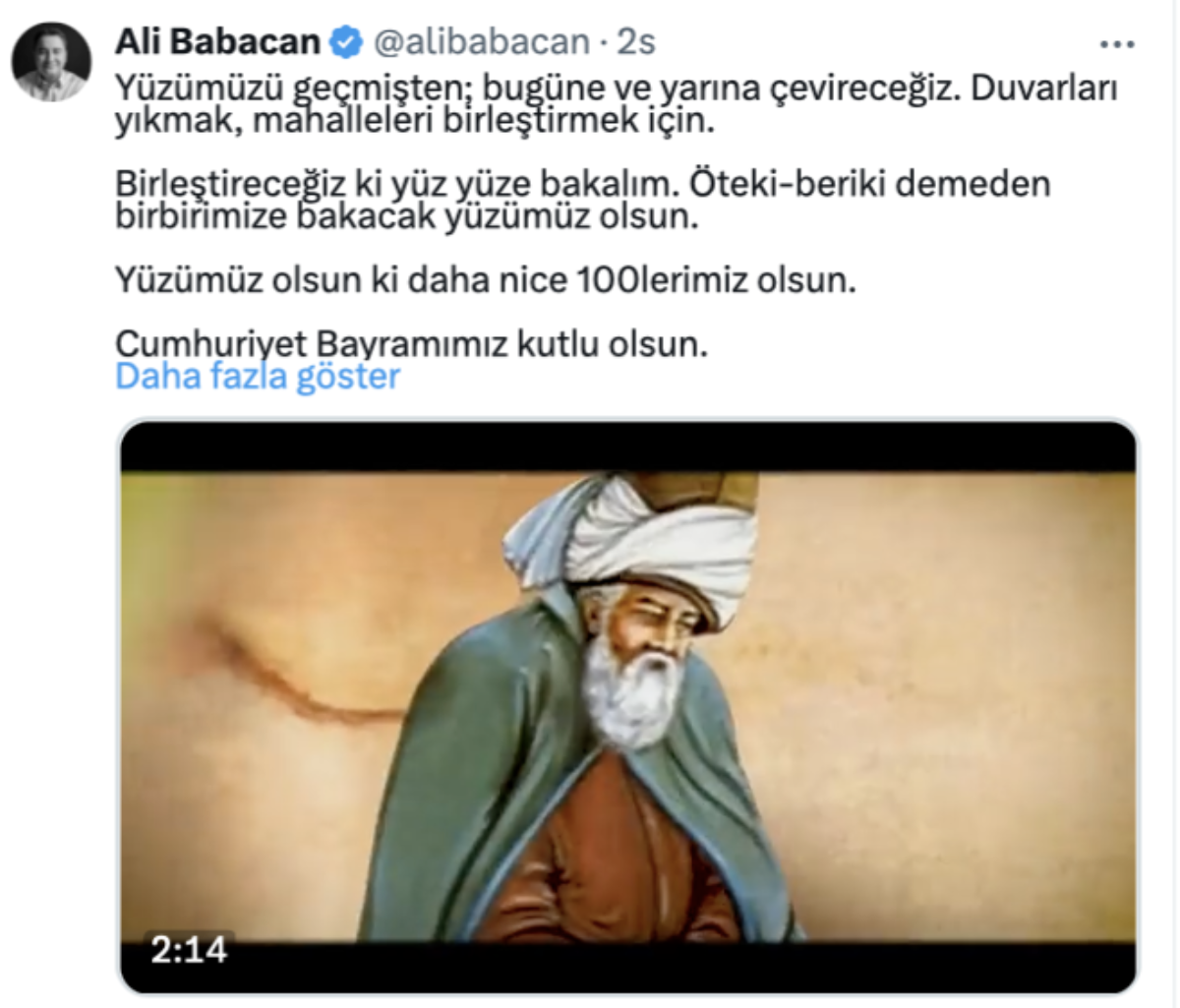 DEVA Partisi lideri Ali Babacan, “Yüzümüzü geçmişten; bugüne ve yarına çevireceğiz. Duvarları yıkmak, mahalleleri birleştirmek için. Birleştireceğiz ki yüz yüze bakalım. Öteki-beriki demeden birbirimize bakacak yüzümüz olsun. Yüzümüz olsun ki daha nice 100lerimiz olsun. Cumhuriyet Bayramımız kutlu olsun” ifadelerini kullandı.