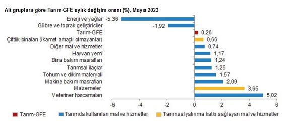 Bir önceki aya göre azalış gösteren alt gruplar sırasıyla, yüzde 5,36 ile enerji ve yağlar ve yüzde 1,92 ile gübre ve toprak geliştiriciler oldu. Buna karşılık, aylık artışın yüksek olduğu alt gruplar ise sırasıyla, yüzde 5,02 ile veteriner harcamaları ve yüzde 3,65 ile malzemeler oldu.