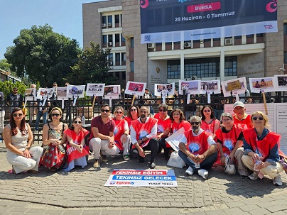 Eğitim Sen Bursa Şube Başkanı Özkan Rona, “Tekinsiz Eğitim, Tekinsiz Gelecek” başlıklı sergiyle Bursa’nın eğitim sorunlarını kamuoyuna duyurmak için Bursa İl Milli Eğitim Müdürlüğü önünde çarpıcı bir eyleme imza attı…