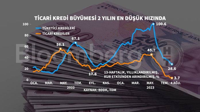 Bankacılık Düzenleme ve Denetleme Kurumu (BDDK) verileri üzerinden yapılan hesaplamalara göre 4 Ağustos haftası itibariyla ticari kredilerde 13 haftalık, yıllıklandırılmış ve kur etkisinden arındırılmış büyüme yüzde 3,7 olarak gerçekleşti. Bu rakam son 2 yılın en düşük seviyesi olarak kayıtlara geçti.