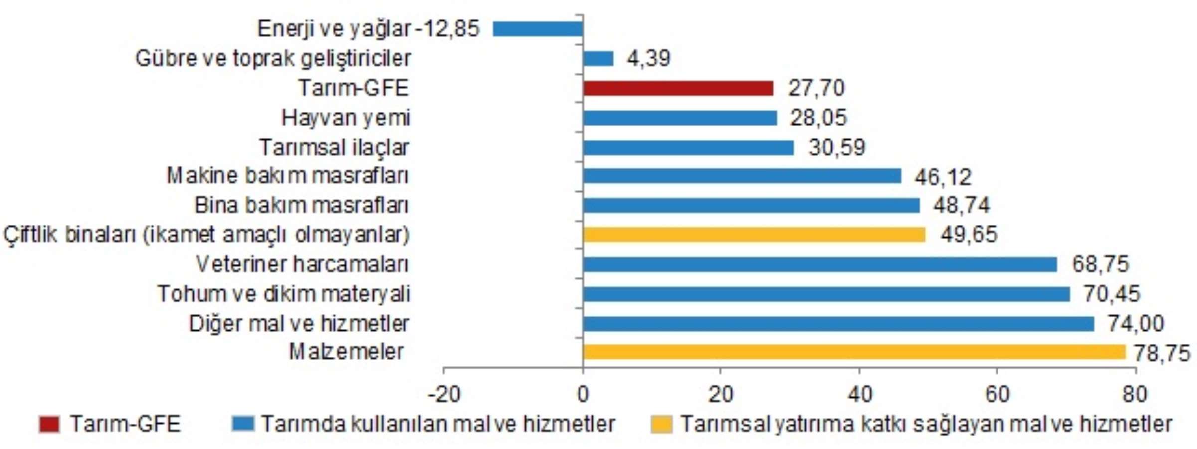 Bir önceki aya artışın düşük olduğu alt gruplar sırasıyla, yüzde 0,78 ile gübre ve toprak geliştiriciler ve yüzde 1,50 ile tohum ve dikim materyali oldu. Buna karşılık, aylık artışın yüksek olduğu alt gruplar ise sırasıyla, yüzde 9,41 ile veteriner harcamaları ve yüzde 8,90 ile enerji ve yağlar oldu.