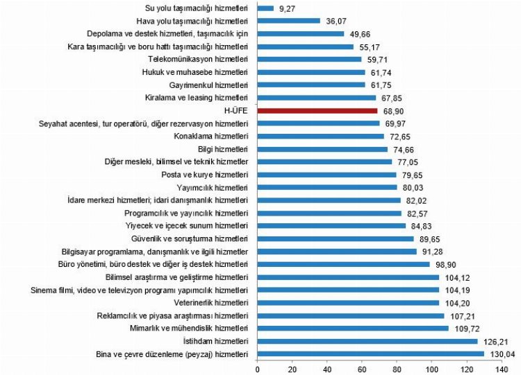 H-ÜFE sektörlerinden su yolu taşımacılığı hizmetleri yüzde 9,27, havayolu taşımacılığı hizmetleri yüzde 36,07, depolama ve destek hizmetleri (taşımacılıkiçin) yüzde 49,66 ile endekslerin en az arttığı alt sektörler oldu. Buna karşılık bina ve çevre düzenleme (peyzaj) hizmetleri yüzde 130,04, istihdam hizmetleri yüzde 126,21, mimarlık ve mühendislik hizmetleri; teknik test ve analiz hizmetleri yüzde109,72 ile endekslerin en fazla arttığı alt sektörler oldu.