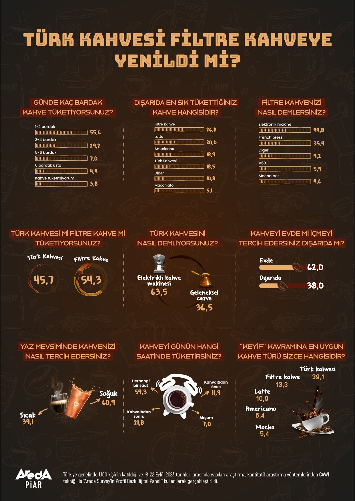 Areda Piar tarafından 18-22 Eylül 2023 tarihleri arasında gerçekleştirilen kahve araştırmasına bin 100 kişi katıldı. Tüketici eğilimlerini düzenli olarak ele alan araştırma, kantitatif araştırma yöntemlerinden CAWI tekniği ile “Areda Piar’ın Profil Bazlı Dijital Paneli” kullanılarak gerçekleştirildi.